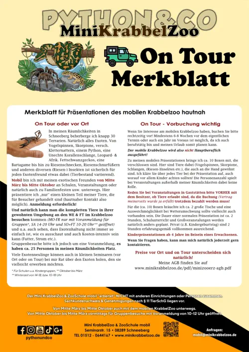 Noch ein wichtiger Hinweis! Sollten Sie sich entscheiden eine Präsentation in einer Gaststätte (o.ä.) zu buchen, setzen Sie sich bitte vorher mit dem Betreiber dort in Verbindung! Wenn ich mit meinem mobilen Krabbelzoo einmal angekommen bin und der Betreiber das aber nicht möchte (keine vorherige Absprache), bleibt der Endpreis für mich davon unberührt! Auch dies kann man in meinen »AGB nachlesen.  Mobile Präsentationen erfolgen von Mitte März bis Mitte Oktober. Bei Temperaturen über 30°C  im Sommer und unter 10°C im Oktober, sind keine (auch gebuchte) mobilen Präsentationen möglich! Das bitte ich zu beachten.